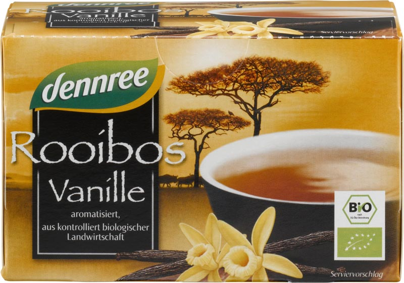 Ceaiul Rooibos cu vanilie bio ofera o savoare pura. Ceaiul Rooibos cu vanilie Dennree este obtinut din cele mai bune crengute ale tufei ce poarta denumirea de „Redbush” si ce creste in padurile de cedru din sudul Africii. Pentru a se obtine aroma delicioasa si calitatea superioara a acestui ceai, el este ales cu grija si prelucrat gentil. Datorita faptului ca acest ceai este sanatos si datorita aromei sale dulci, ceaiul Rooibos a reusit sa castige multi admiratori chiar si in afara granitei Africii. Acest ceai Rooibos este armonic asezonat prin adaugarea unei arome fine de vanilie. Savurati aceasta parte a Africii in fiecare zi si in fiecare anotimp.