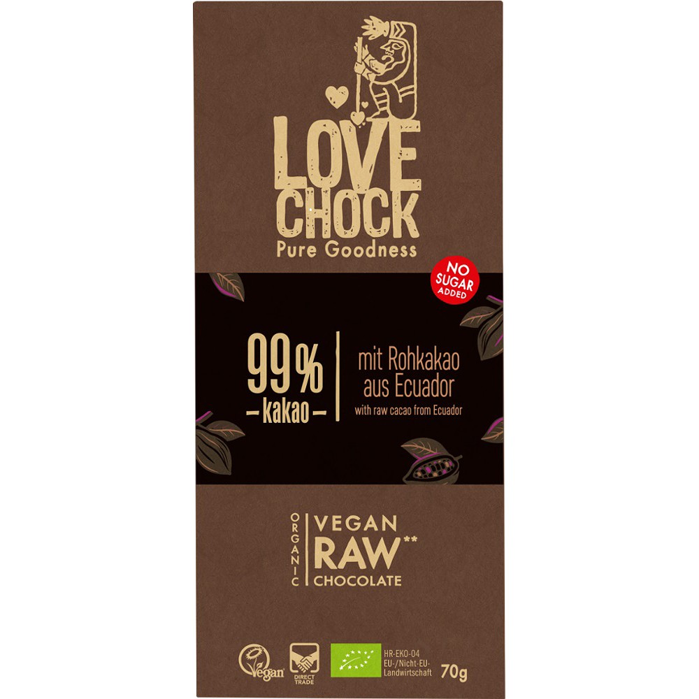 Lovechock, ciocolata RAW VEGANA extreme dark 99% cacao este 100% BIO, este potrivita pentru o dieta vegana, contine flavonoide, nu contine lactoza, soia si gluten. Ciocolata poate contine urme de nuci. Ciocolata Extreme Dark este fara zahar adaugat. Protectia mediului este aproape de inima companiei: Din 2011, intregul ambalaj este lipsit de plastic si, prin urmare, 100% compostabil.