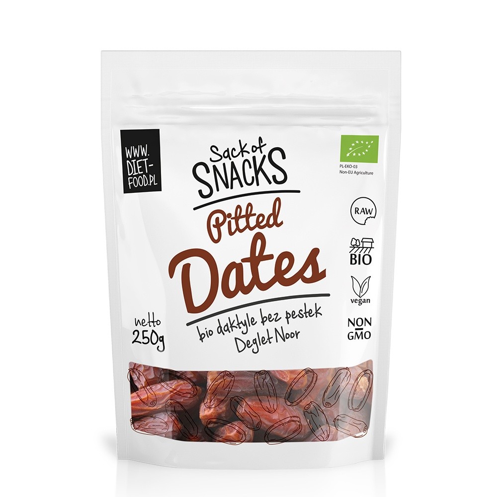 Caracteristici: produs bio, raw,vegan Gramaj: 250g Descriere Produs: Pachetul cu snacks-uri este o serie de gustari organice Diet Food. Deglet Nour este un soi deosebit ca aroma si consitenta. Curmale uscate fara samburi Deglet Noor sunt produse raw vegane, delicioase ca atare sau ca un plus adaugat la musli, prajituri, deserturi, gemuri. O alternativa excelenta de inlocuire a dulciurilor in dieta sau la copii. Snackul de sanatate !!! Ingrediente: curmale proapete Deglet Noor* * ingredient provenit din Agricultura Ecologica Origine: Agricultura Ecologica non UE Alergeni: produsul poate contine gluten, alune si alte fructe cu coaja, susan, soia Certificare: PL-EKO-03 Utilizare: un snack perfect pentru orice ora a zilei, mai ales pentru vegetarieni si adeptii dietei raw vegan dar si ca adaos la cereale, prajituri sau sub forma de gem. Termen valabilitate: 2 ani de la producere Origine: Agricultura Ecologica non UE Conditii de pastrare: in loc uscat, ambalajul de tip zip permite inchiderea etansa dupa fiecare utilizare Diet Food este o companie specializata in produse bio dietetice fara carbohidrati, fara gluten din konjac si din soia si produse bio de tip superfood si superalimente: pulberi organice si amestecuri de pulberi organice speciale pentru detoxifiere, slabire, sportivi, energie zilnica.
