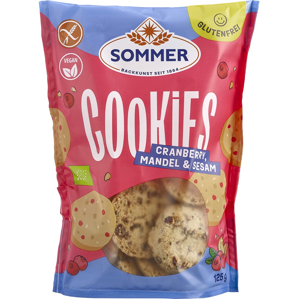 Biscuiti de vara fara gluten si merisor, migdale si susan. Deliciosii biscuiti vegani sunt rafinati cu afine si migdale, susan, seminte de chia si vanilie. Exista 6 cookie-uri ambalate individual în fiecare cutie.