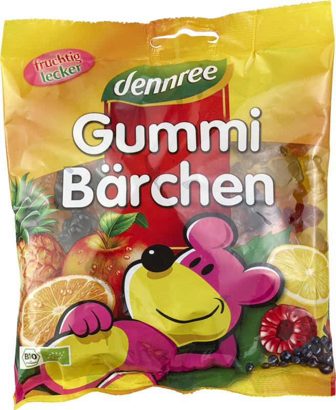 Ursuletii din gelatina bio Dennree au o aroma pura si plina de savoare. Ursuletii din gelatina Dennree sunt obtinuti din suc de fructe bio delicios. Sucurile folosite sunt cele de: mere, lamaie, portocale, ananas si coacaze negre. Ei sunt indulciti cu zahar de trestie brut si sirop de porumb. Desigur, noi nu folosim coloranti si arome artificiale (in conformitate cu reglementarile UE-ECO). Un deliciu fructos pentru mic si mare – de la primul pana la ultimul ursulet.