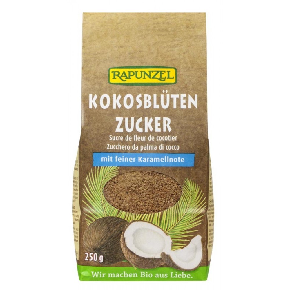 Dulceata naturala de la tropice – zaharul din floari de cocos se obtine din sucul pur al florilor de cocos. Cu aroma sa fina de caramel, este îndulcitorul alternativ ideal. Zaharul din floarea de nuca de cocos Rapunzel este fabricat în mod traditional de catre fermierii indonezieni si permite numeroaselor familii sa aiba un venit constant si regulat.